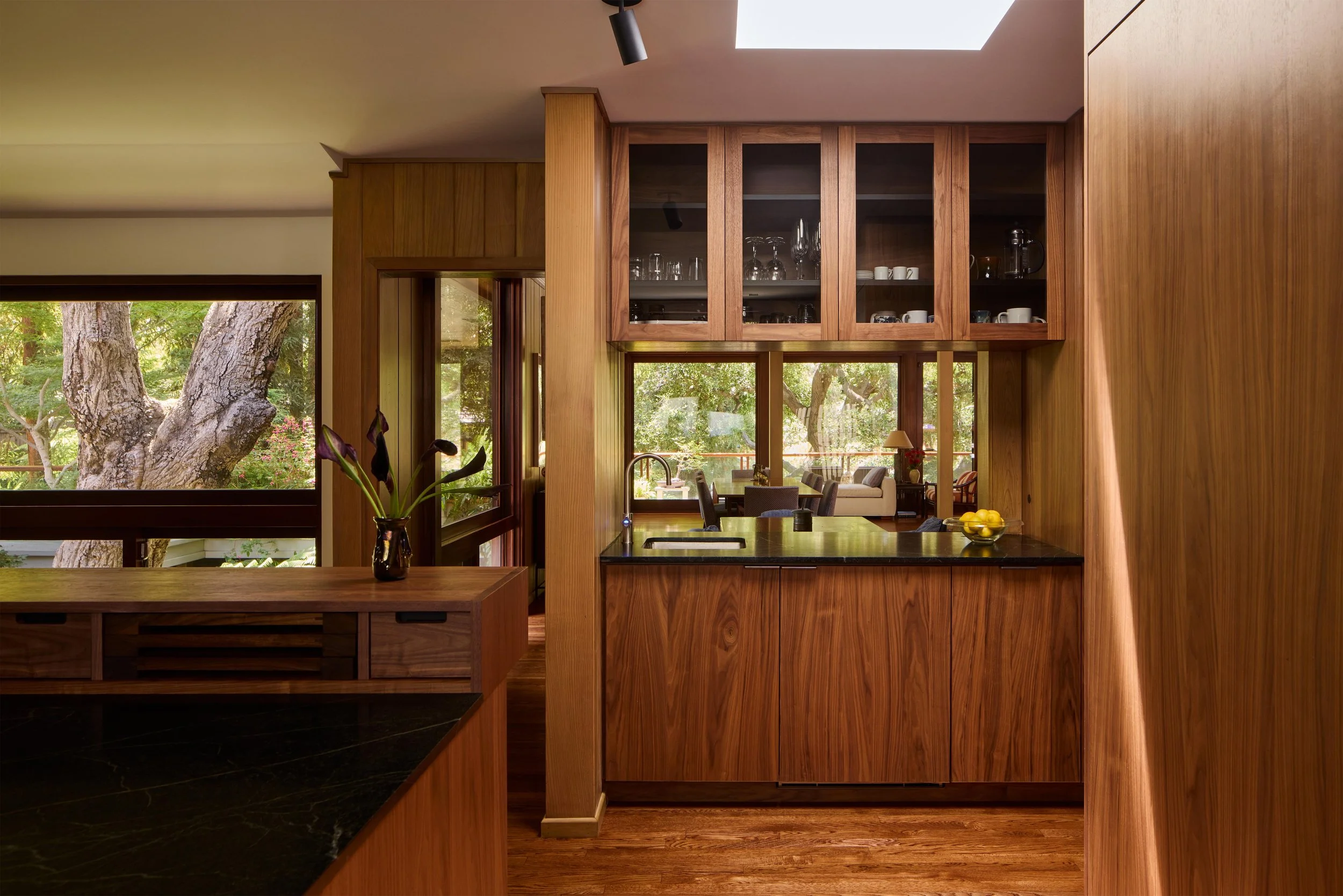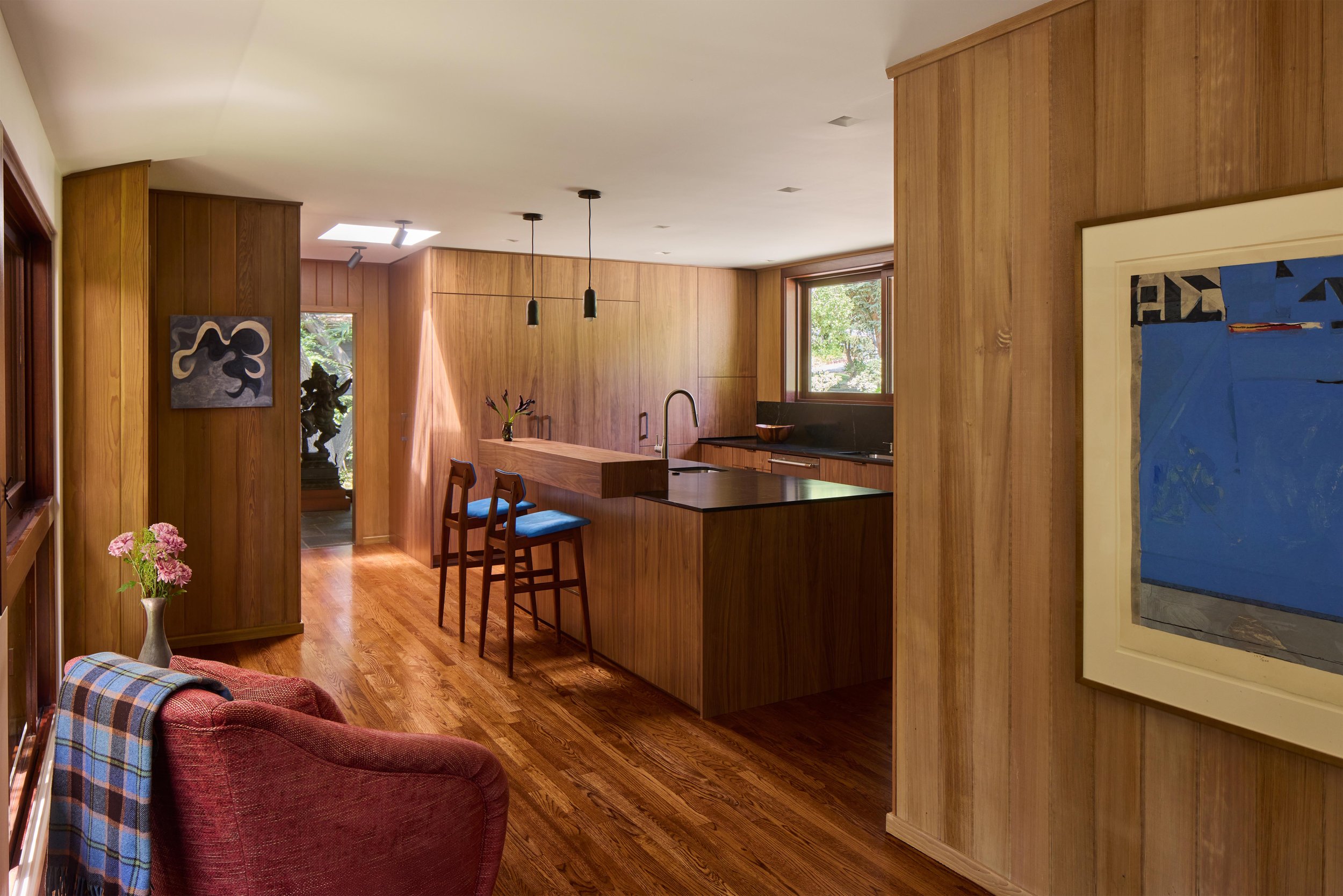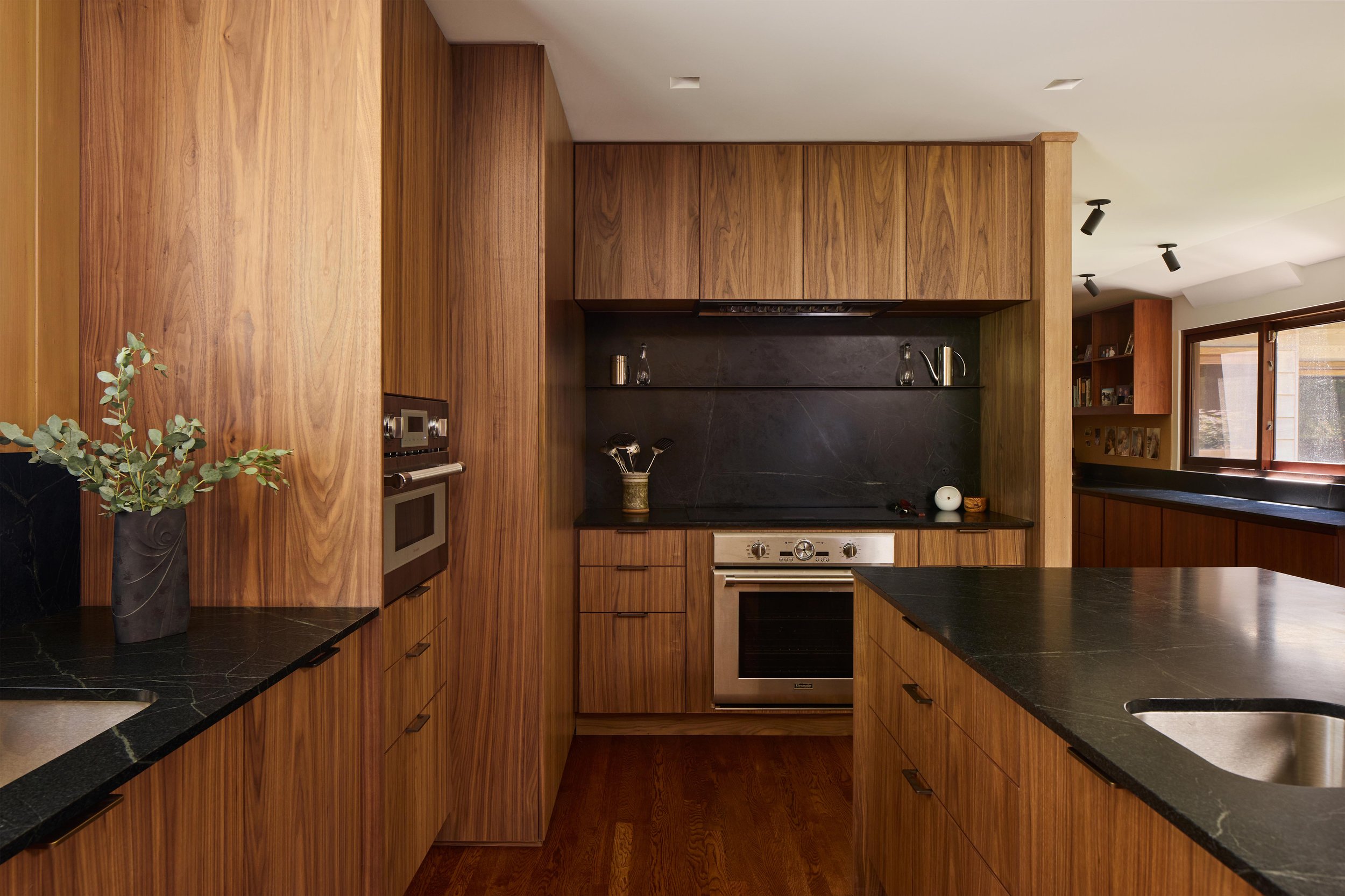 In collaboration with Henrybuilt, the layout was reconfigured to improve flow and sightlines, including a coffee bar that frames the landscape. Walnut cabinetry complements existing mahogany windows and Douglas fir paneling, while soapstone countertops introduce a rich, moody palette.