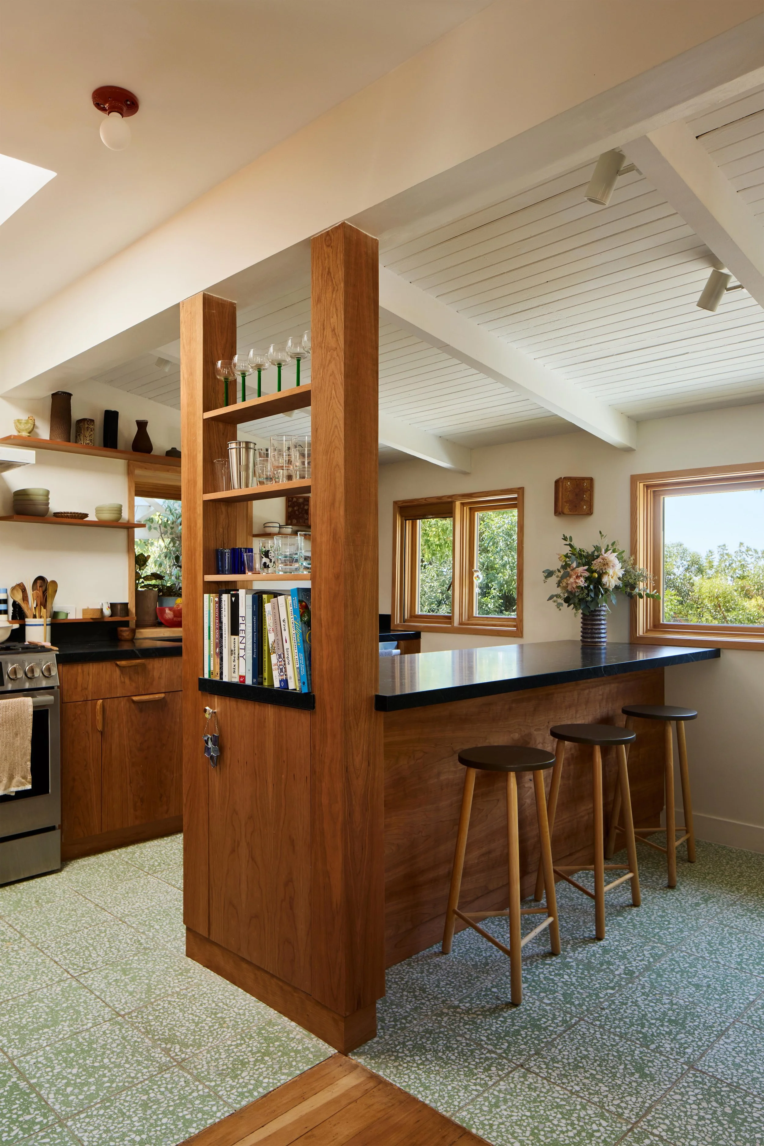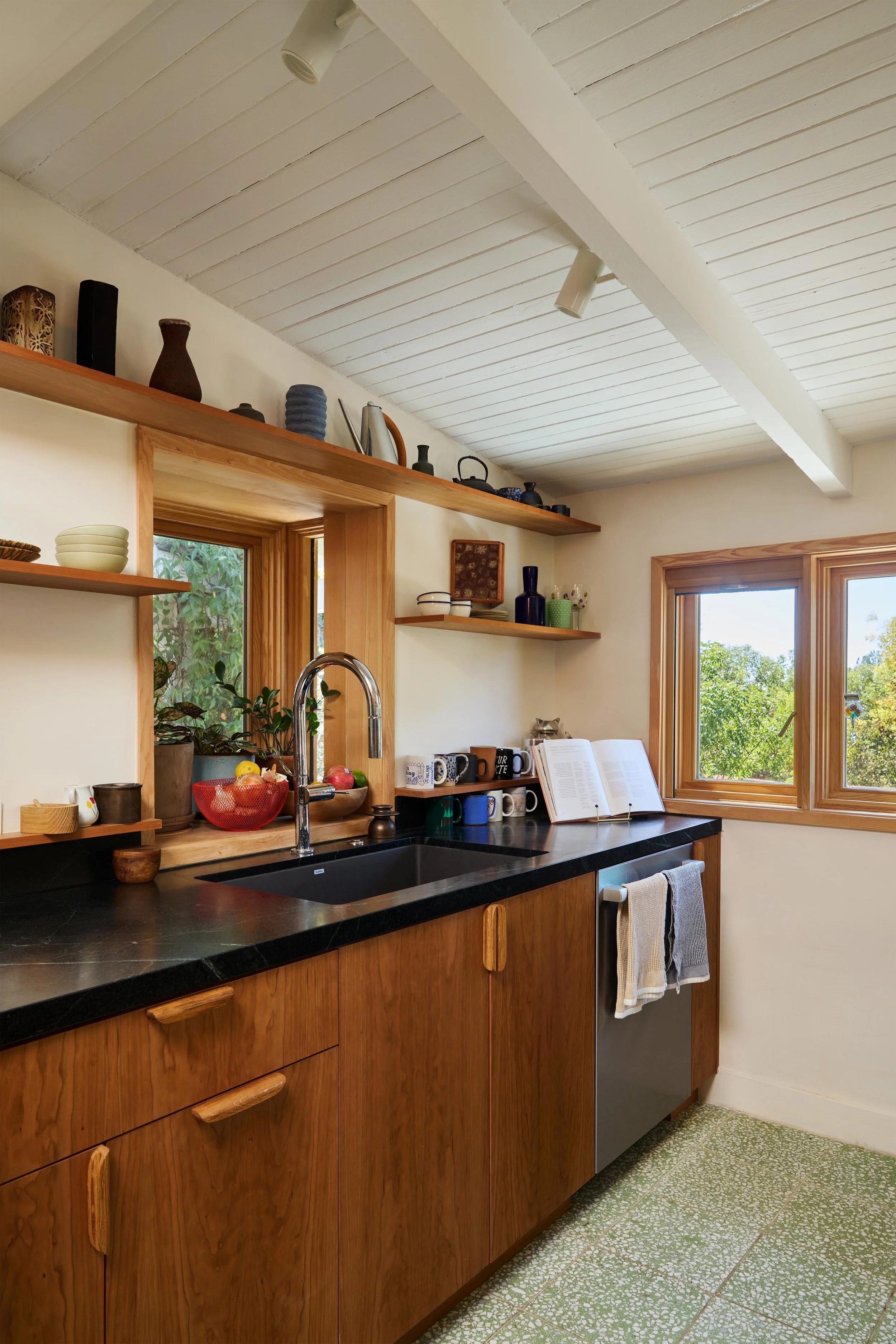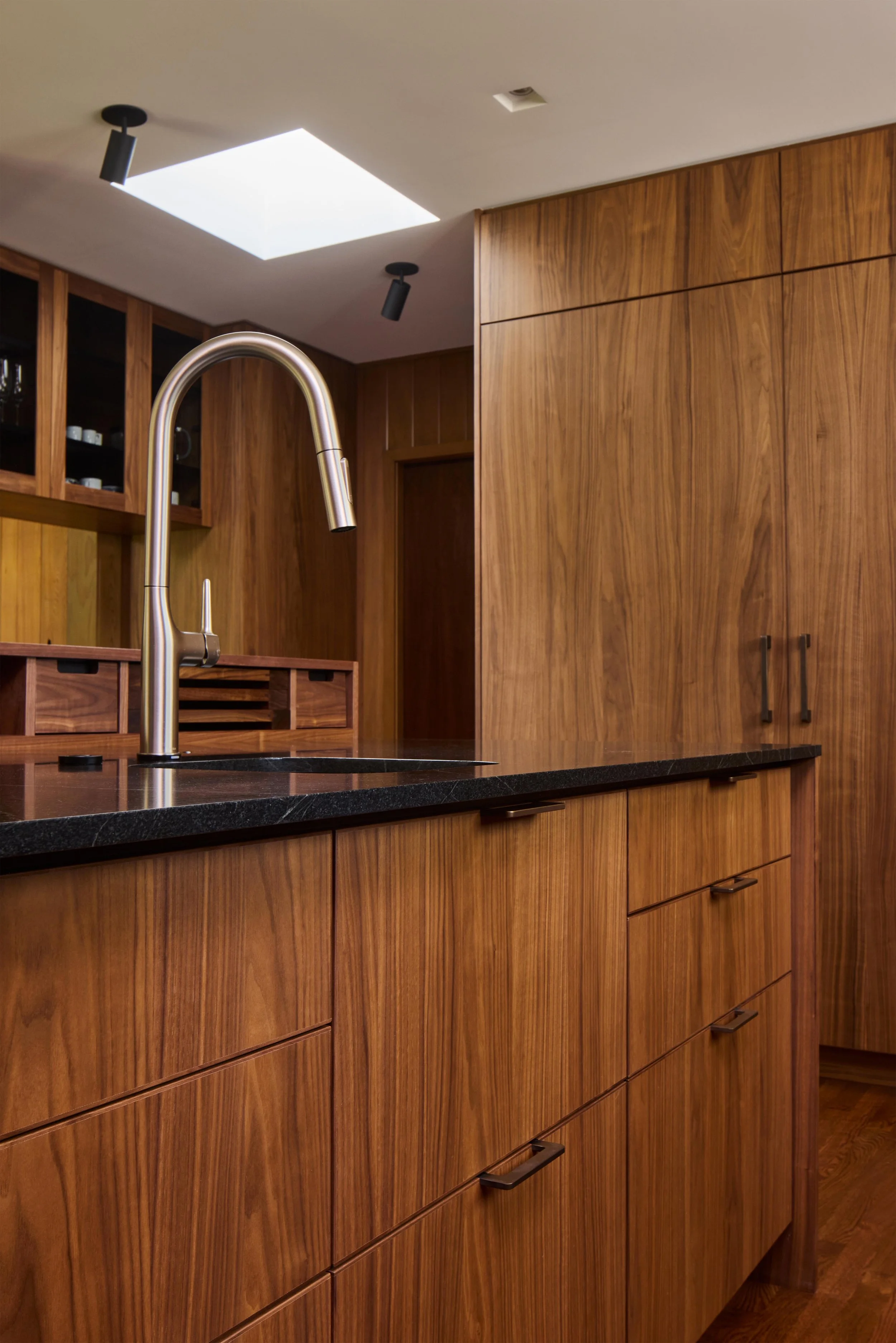 In collaboration with Henrybuilt, the layout was reconfigured to improve flow and sightlines, including a coffee bar that frames the landscape. Walnut cabinetry complements existing mahogany windows and Douglas fir paneling, while soapstone countertops introduce a rich, moody palette.