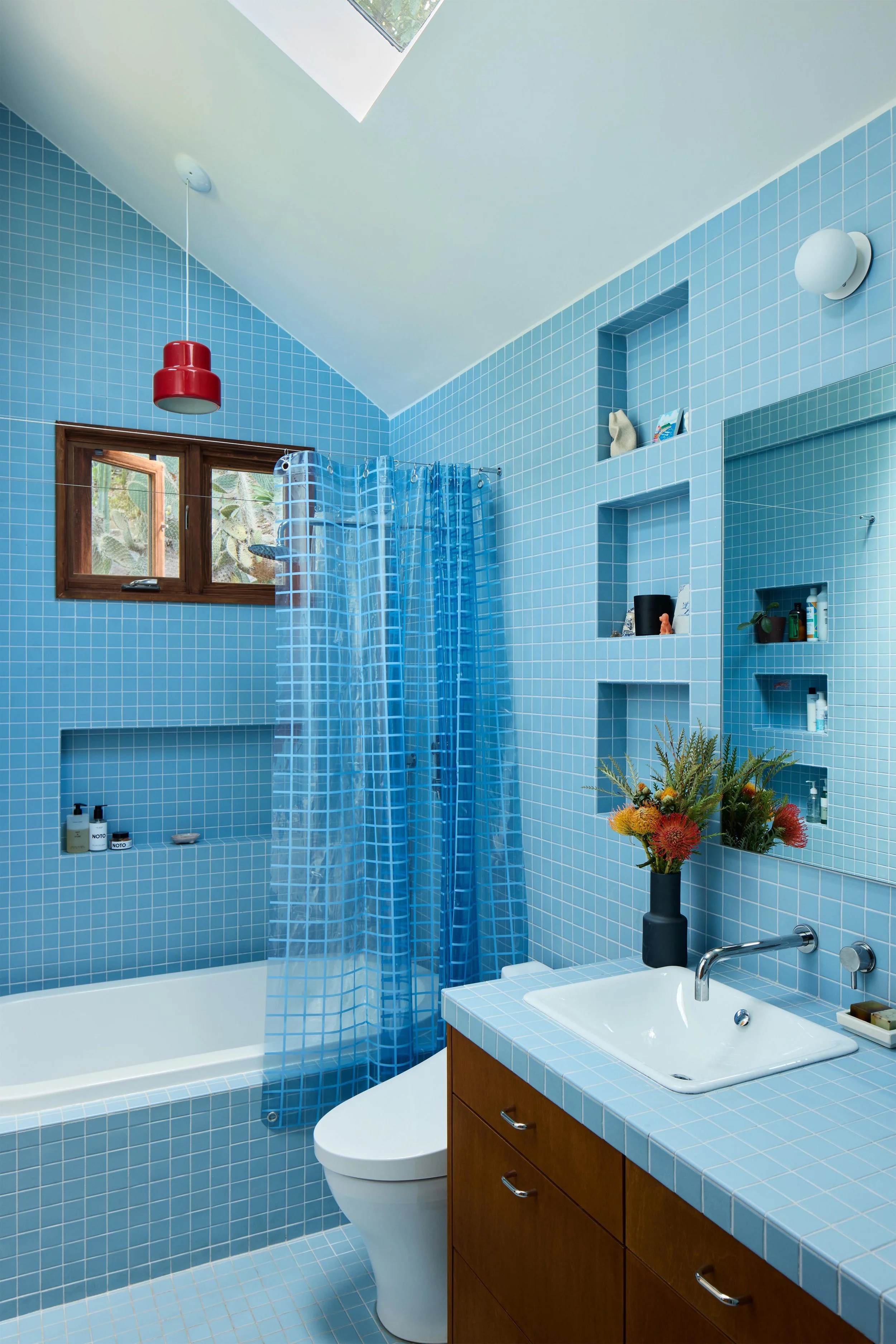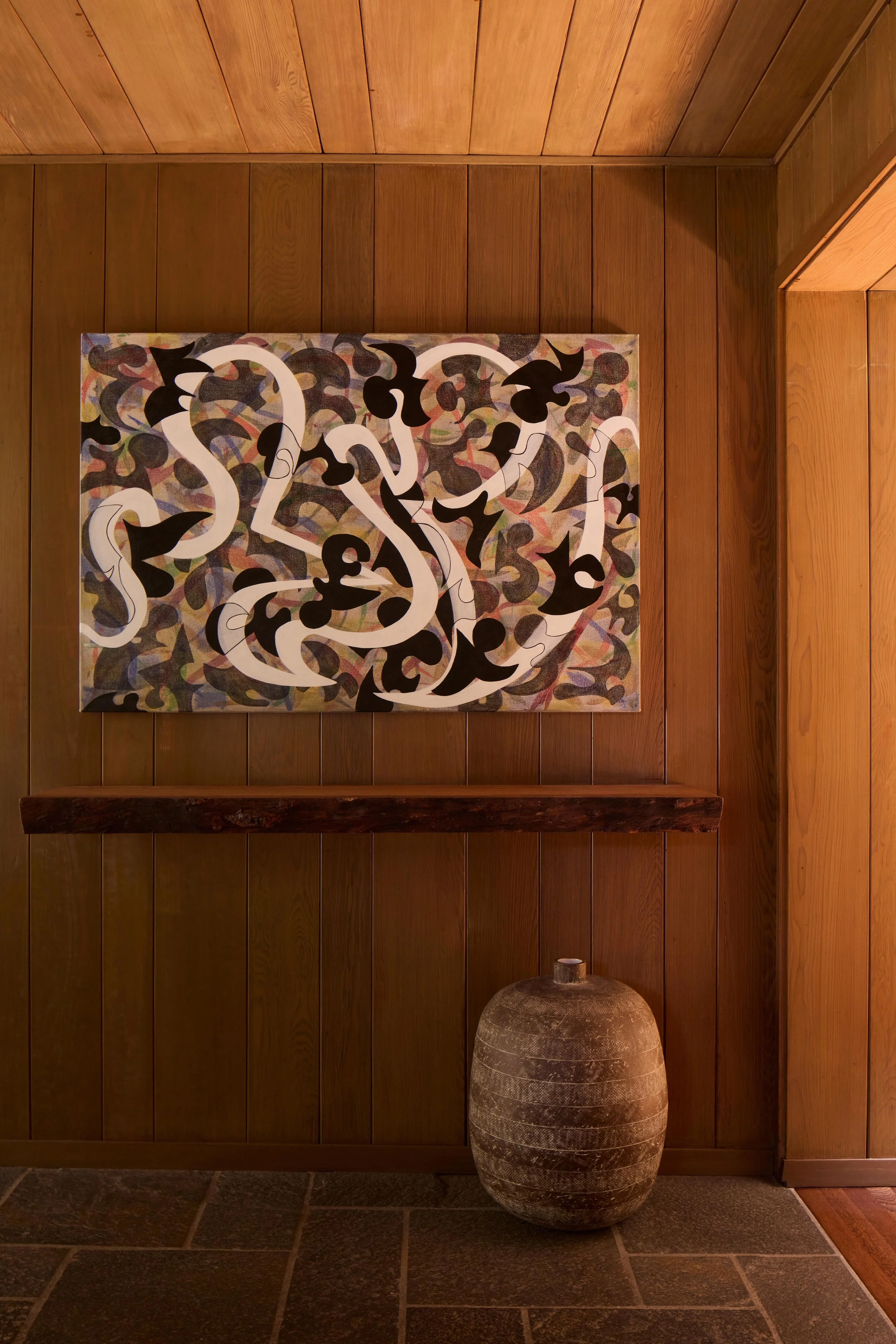 The entryway was also updated with a custom wood slab shelf by Angel City Lumber, crafted from an oak tree felled on the property—adding a meaningful connection to the site.